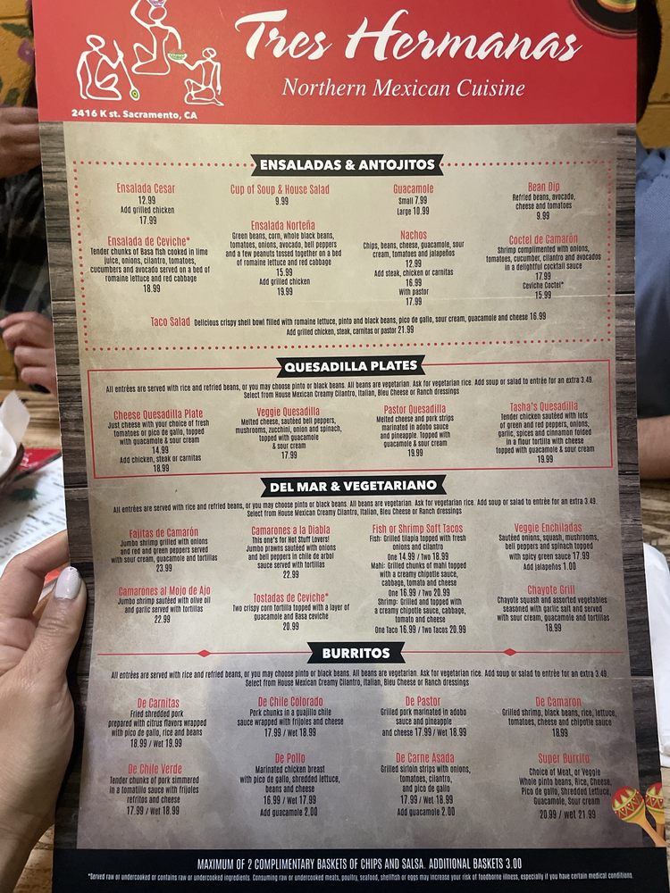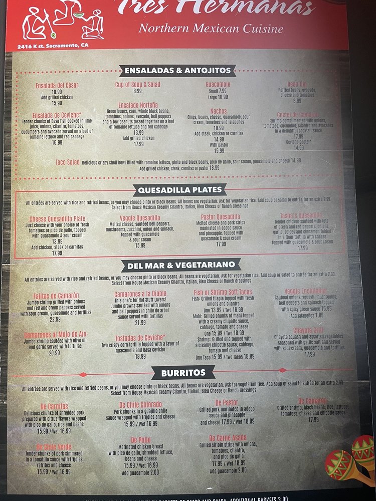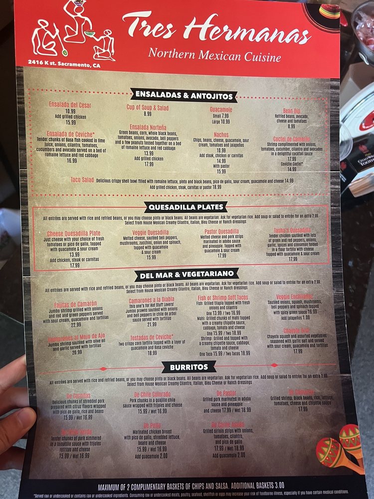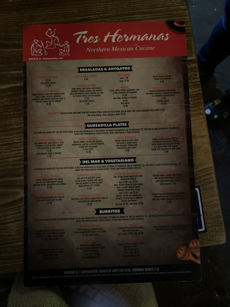 Introducing the menu at Tres Hermanas, a Mexican restaurant located in Sacramento. Known for its authentic cuisine, the restaurant offers a range of options, including vegan and vegetarian dishes. The restaurant provides various amenities such as takeout, delivery, and outdoor seating. Customers rave about the flavorful dishes, generous portions, and fast service. Highlights include the albóndigas soup, carne asada burrito, camarones Al mojo de ajo, and chilaquiles. The ambiance is described as cozy with traditional Mexican decor. The staff is friendly and attentive, enhancing the overall dining experience. Tres Hermanas has become a beloved spot in the Sacramento community, offering a taste of authentic Mexican flavors that keep customers coming back for more.